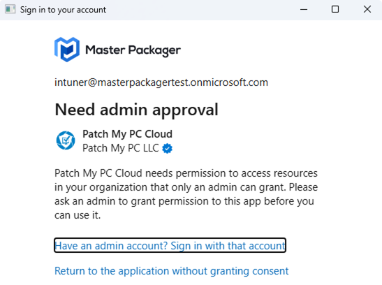 To be able to upload applications to PMPC you must first sign in using an account that has either Global Administrator, Cloud Application Administrator, or Application Administrator in your Microsoft Entra tenant. This is required to register a Microsoft Entra application that allows Master Packager Toolbox to communicate with Microsoft Graph API. If you do not have the required permissions, you will receive the following message: