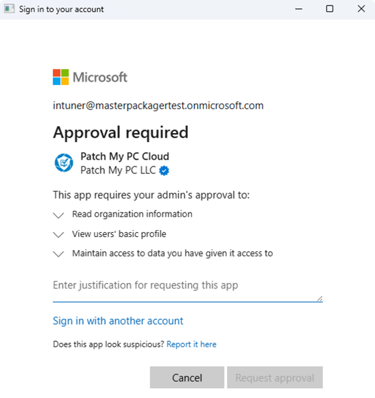 However if your organization has allowed users to request admin approval then you will receive the following message: