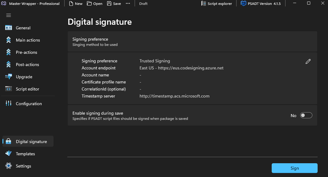 The Digital Signature section in Master Wrapper enables signing of PSAppDeployToolkit (PSADT) script files, ensuring integrity and authenticity before deployment. This feature allows configuration of different signing methods and automation of the signing process during package saving.