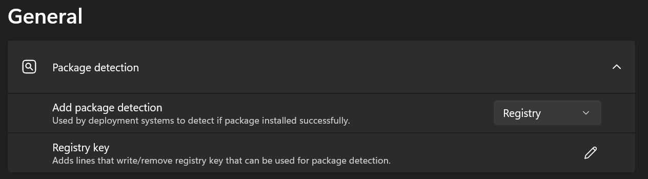 - Registry key – Adds lines that write/remove registry key that can be used for package detection.