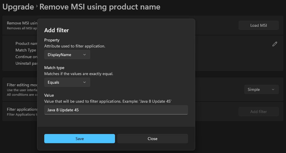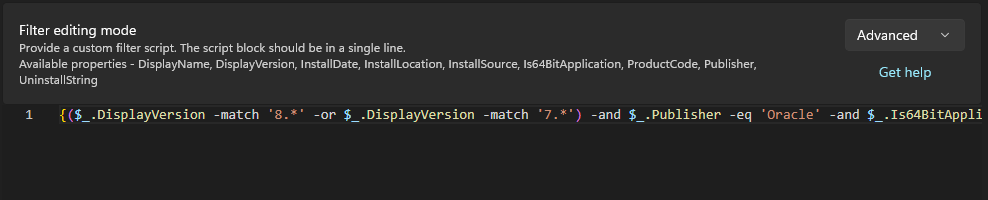 For more complex removal scenarios, Advanced filter editing mode allows creating custom filter scripts using PowerShell syntax. This mode is ideal for precise targeting when multiple conditions need to be met before an application is removed.